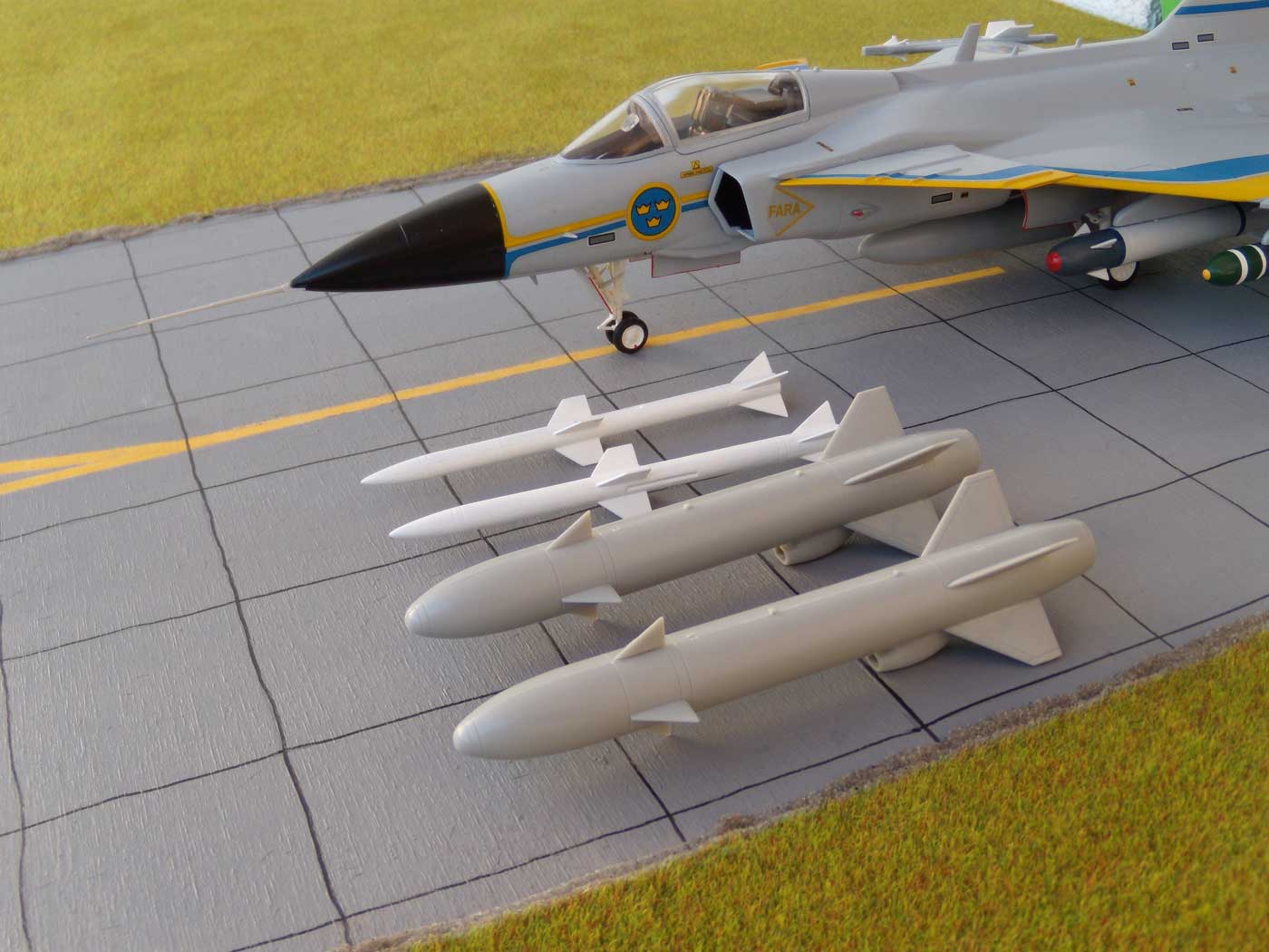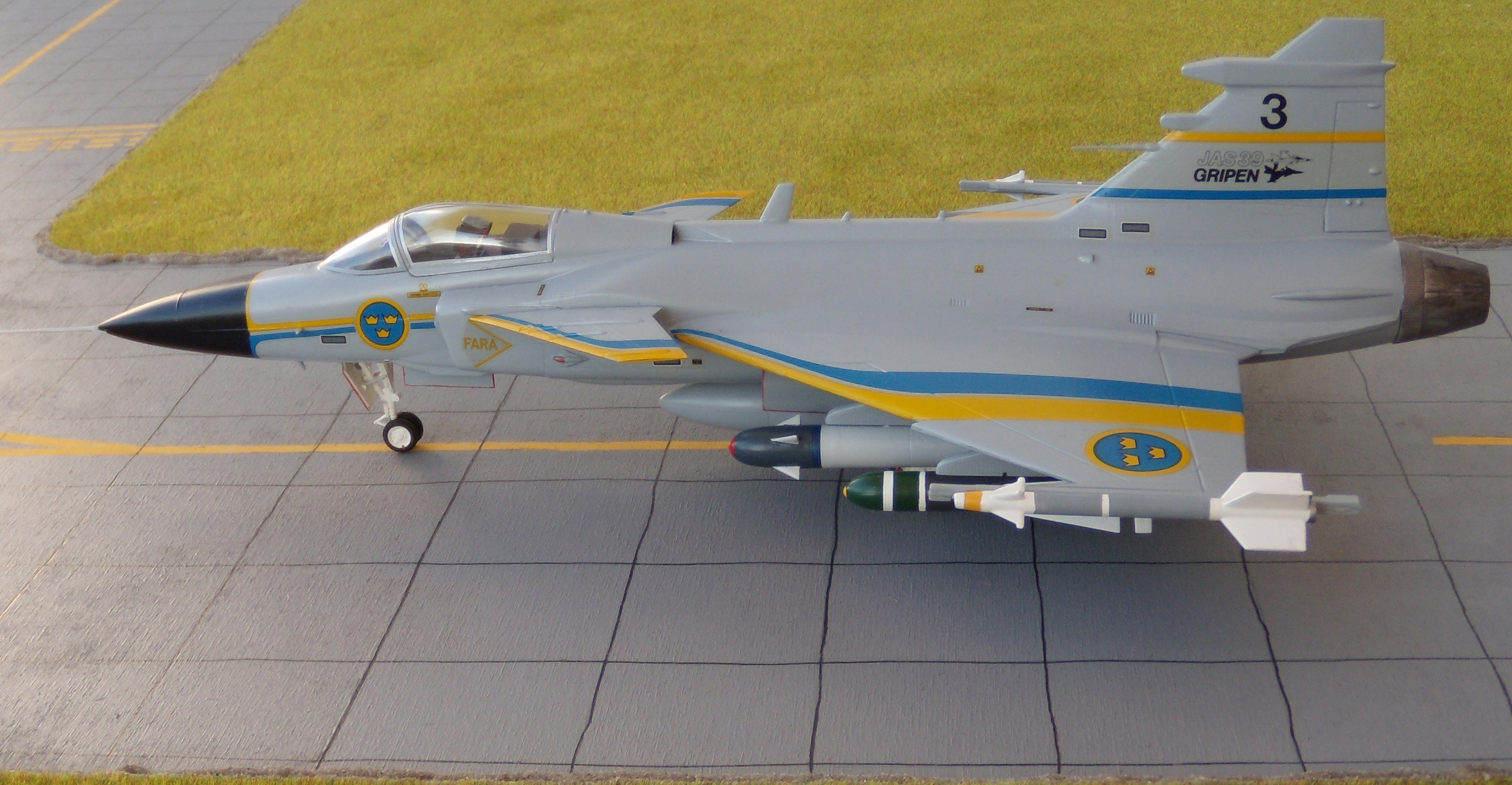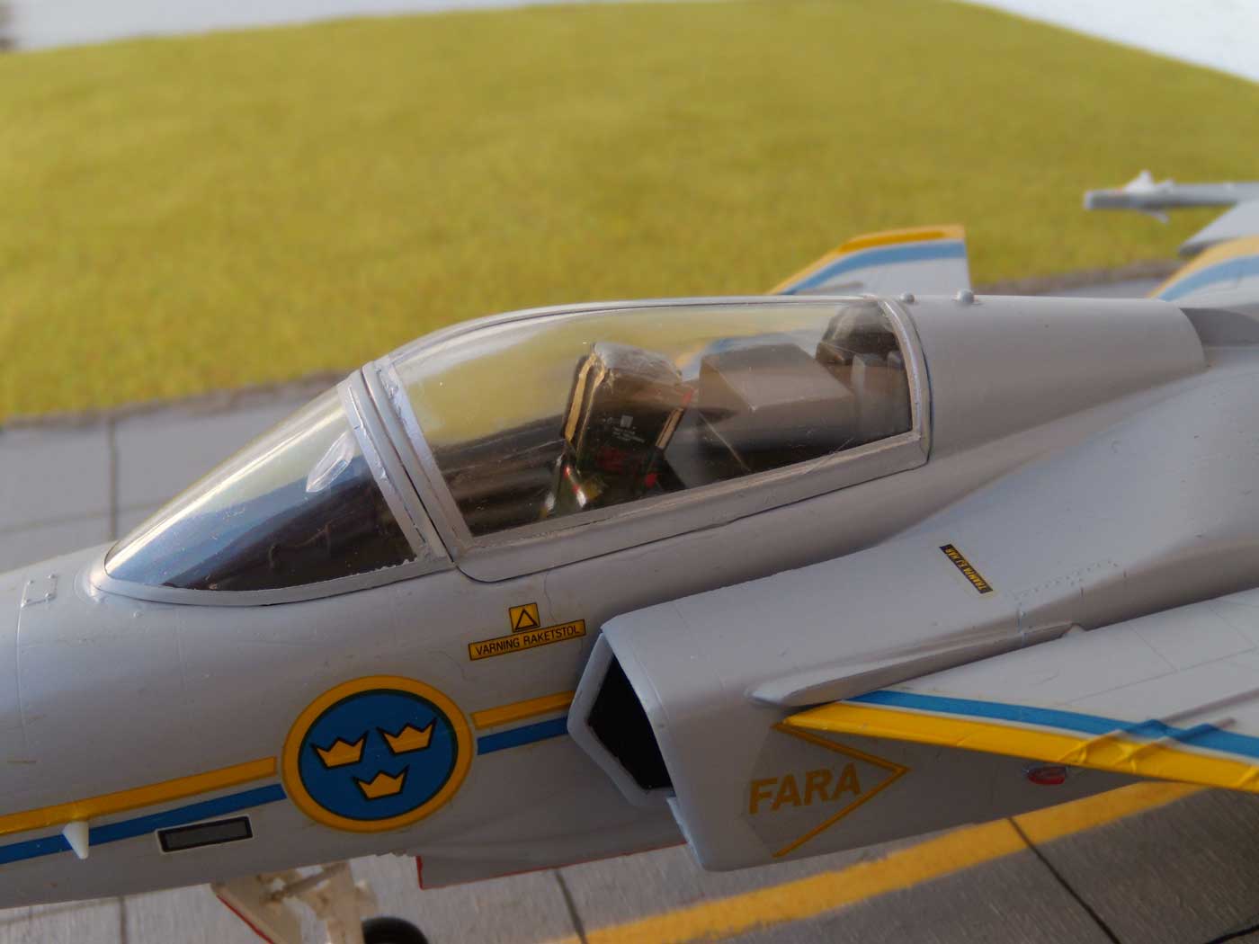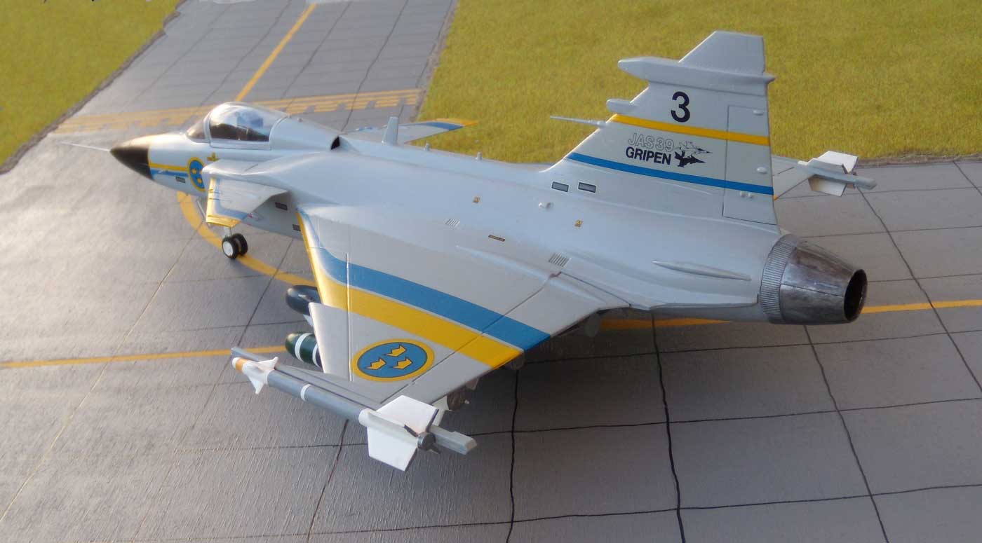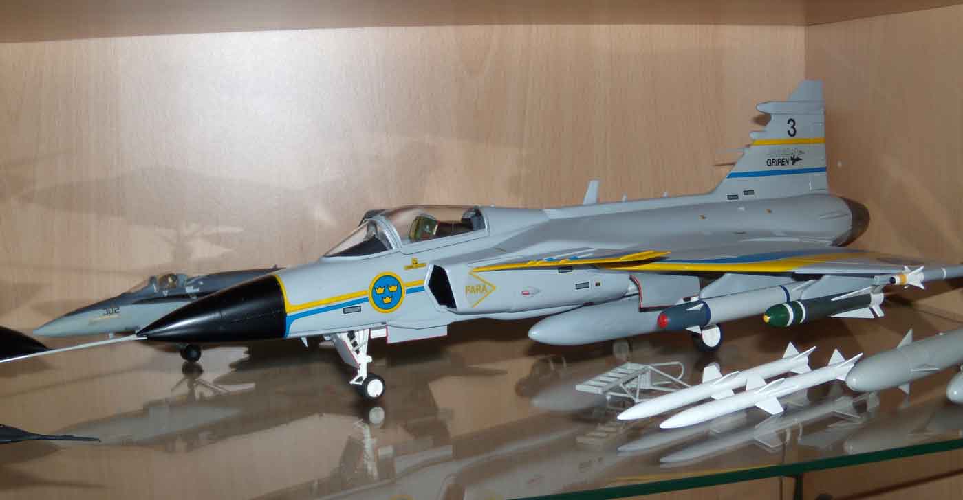 Die Indienststellung erfolgte am 6.Juni 1996. Dieses Mehrzweckkampfflugzeug ( JAS steht für J=Jakt, A=Attack, S=Spaning Jagd, Angriff, Aufklärung ) zeichnet sich durch eine Reihe positiver Eigenschaften aus. Dazu gehören: flexibler Einsatz, sehr gute Manövereigenschaften, sehr gutes Preis/Leistungsverhältnis, umfangreiche Bewaffnungsvarianten, relativ einfache und Wartung. Die sehr guten Flugeigenschaften sind nicht zuletzt den Canards (Entenflügel) geschuldet. Diese Erfindung der Gebrüder Wright ist also schon sehr alt, wurde aber bisher wenig genutzt. In der neueren Entwicklung werden sie aber oft, wegen ihrer sehr guten Eigenschaften bei der Steuerung und hohen Anstellwinkeln, eingesetzt. In der "Moderne" sind sicher die XB-70, Tu-144, T-4 Sotko, Suchoj S-37 Berkut, Gumman X-29, F-22 und Nachfolger, Eurofighter und T-50 zu nennen. Eine b e s o n d e r e Fähigkeit besitzt die Gripen, die fast alle NATO-Flugzeuge nicht haben - sie kann auch auf unbefestigte Plätzen starten und landen !! Eine umfassende Modernisierung wurde 2007-2008 durchgeführt.. Somit ist die Gripen auch weiterhin auf einem hohen Stand der Technik. Diese Fakten sorgen auch dafür, dass dieses Flugzeug auch in vielen anderen Ländern eingesetzt wird: Südafrika, Ungarn, Tschechien, Thailand, UK (RAF) ... Einmal habe ich den Prototyp schon mal gebaut, aber dann verschenkt